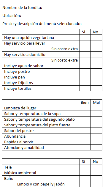 Y pues en cuanto a la hoja de evaluación que manejas, sí tienen opciones vegetarianas y servicio para llevar, pero no a domicilio. Incluye todo.